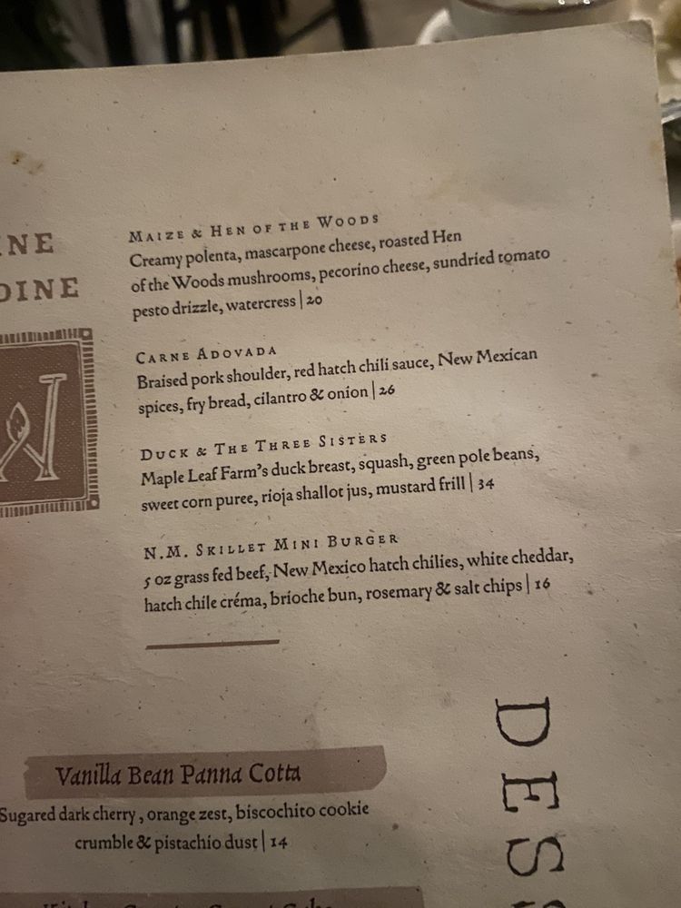 Butternut squash puree, pecan crumble, simmered red Hatch chili jus, fried sage